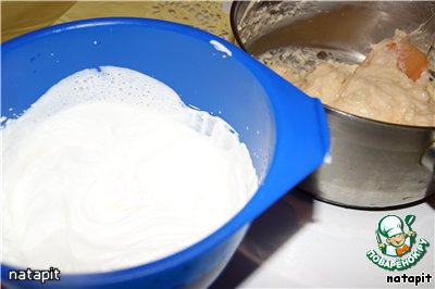 Сливки взбить до устойчивых пиков с сахарной пудрой и соединить с остывшим кремом.
