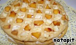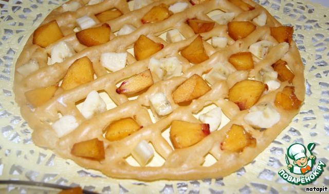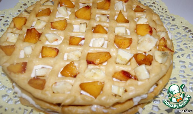 Поместить корж на блюдо, в каждый квадратик положить кусочки фруктов чередуя персик и банан. Смазать лимонным кремом.