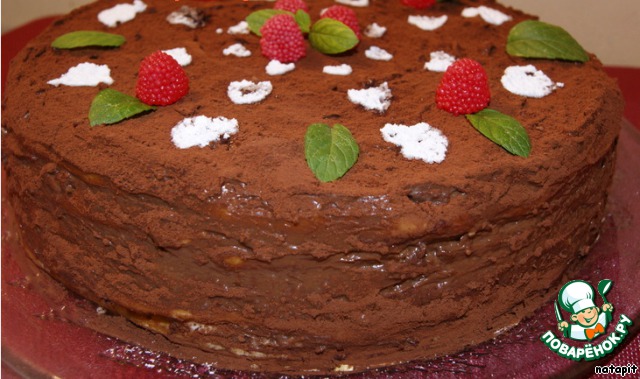 Последний корж смазать оставшимся кремом. Верх и бока смазать шоколадным кремом. Поставить в холодильник на 5-6 часов, перед подачей посыпать какао и украсить.